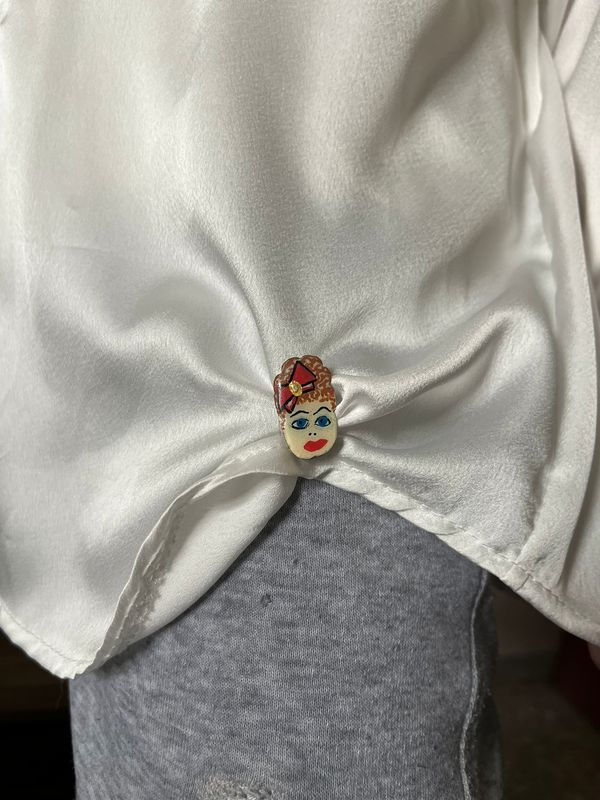 סיכה קטנה ומקסימה בגודל כ- 2.5 ס''מ , המעוצבת בדמות אישה עם תסרוקת גבוהה ומרשימה. שיערה הג'ינג'י בוהק ומתוחזק בקפידה, מעוטר בפפיון אדום עליז שמוסיף לה מראה שובב וצבעוני . הסיכה משדרת חן ואופי ייחודי, מושלמת כתוספת דקורטיבית למי במחפשת אביזר קטן עם אמירה שובבה ונשית.