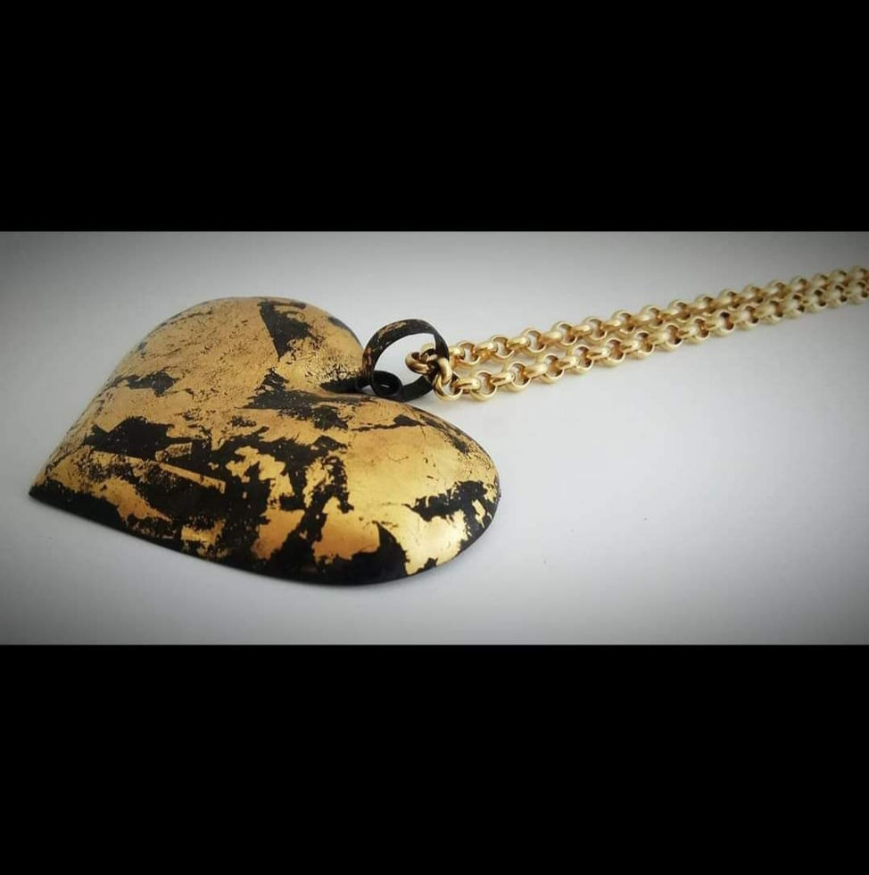 שרשרת לב סימטרי בניפוח שחור עם עלי זהב